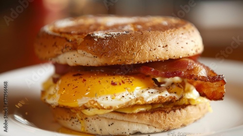 A breakfast sandwich with egg, bacon, and cheese on a toasted English muffin