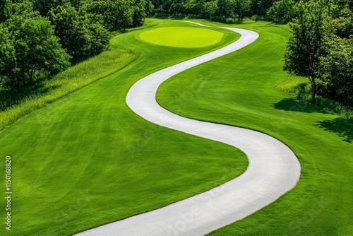 A breathtaking aerial view of a championship golf course with sprawling greens, sand traps, and winding paths