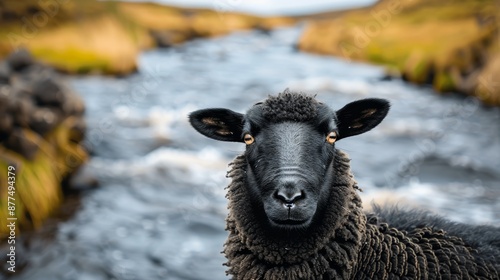 A breathtaking and clear photo of a black sheep near a tranquil, flowing river, focus cover all object