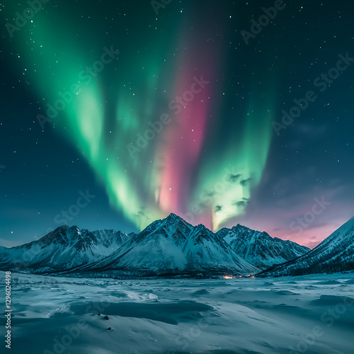 A breathtaking aurora borealis lighting up the night sky over a snow-covered landscape, with twinkling stars and icy peaks