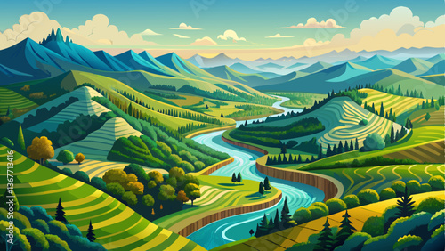 A breathtaking bird's-eye view where a meandering river carves through lush, rolling hills