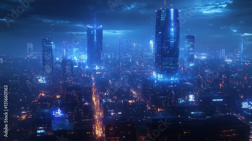A breathtaking city skyline glows with blue and neon lights as towering structures loom overhead. The vibrant streets pulse with life, reflecting the energy of a future metropolis at dusk