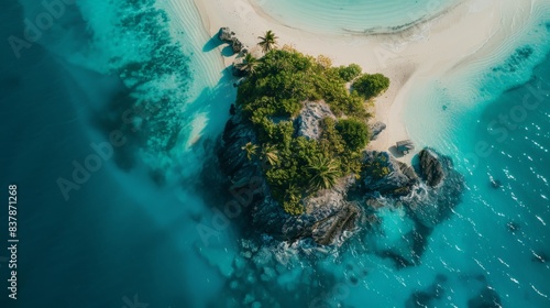 A breathtaking drone view of a remote island, surrounded by stunning turquoise water and pristine white sand beaches.