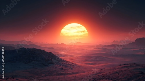 A breathtaking landscape at dusk featuring a vibrant red sun setting over distant mountains, casting a warm glow on serene desert terrain. The atmosphere is tranquil and otherworldly.