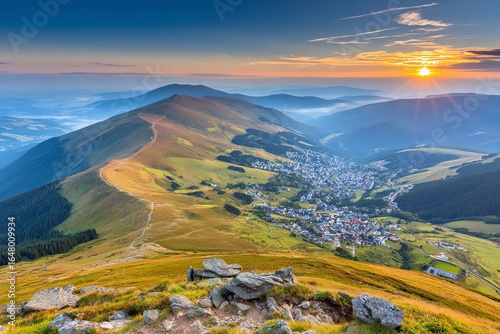A breathtaking panoramic view captures a small town nestled amongst rolling, verdant mountains bathed in the warm glow of a setting sun, evoking a sense of peaceful isolation.