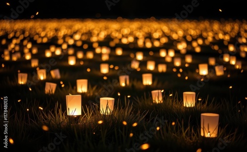 A breathtaking scene of numerous glowing sky lanterns ascending into a starry night sky over a scenic landscape.