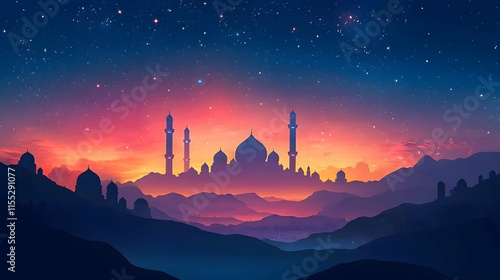 A breathtaking silhouette of a grand mosque against a vibrant sunset, under a starry night sky, surrounded by rolling mountains. A Serene Nightscape.