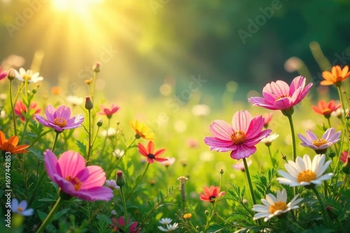 A breathtaking sunlit meadow bursting with vibrant wildflowers, shimmering dew drops on petals, a scene of enchanting, fairytale beauty , pixie, beautiful