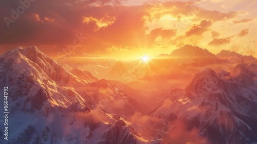 A breathtaking sunrise over snowy mountains, with warm golden light spreading across the peaks and highlighting the contrast between the cold snow and warm sun rays.