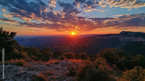 A breathtaking sunset over a mountain range with a fiery sky, casting a warm glow on the landscape.