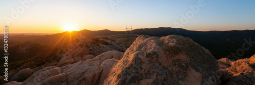 A breathtaking sunset view from a rocky mountain featuring wind turbines silhouetted against the vibrant sky, capturing the essence of renewable energy and nature's beauty.