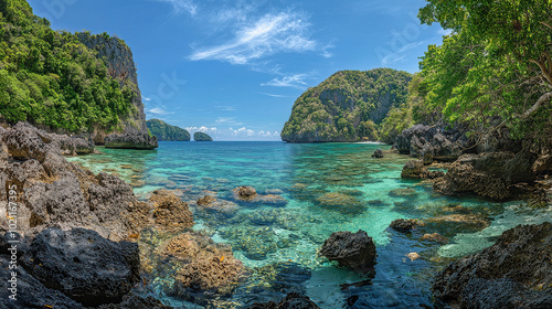 A breathtaking turquoise lagoon nestled between two lush, rocky cliffs under a clear blue sky, reflecting vibrant tropical colors in the pristine waters.