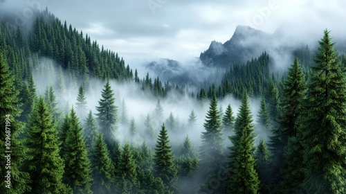 A breathtaking view of a dense evergreen forest shrouded in mist, with majestic mountains looming in the background, evoking a sense of adventure and mystery.