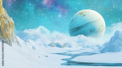 A breathtaking view of a frozen alien landscape, with a celestial planet in the background. A stunning winter wonderland, a sight to behold.