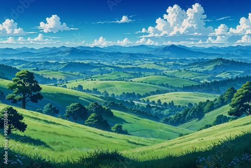 A breathtaking view of a lush green valley surrounded by rolling hills and blue skies, ideal for landscape and nature content.