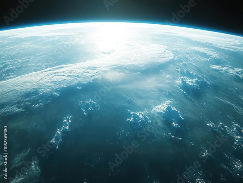 A breathtaking view of a planet's horizon from space, highlighting the curvature of the earth with sunlight casting a serene glow over the oceanic expanse.