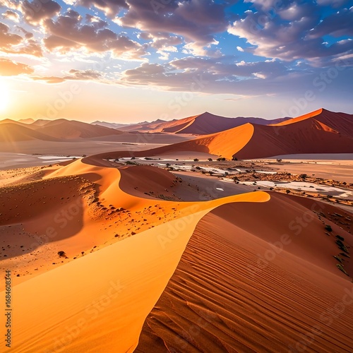A breathtaking view of colorful sand dunes at sunrise, showcasing the dramatic landscape of a desert.