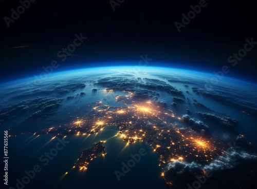 A breathtaking view of Earth from space as the sun rises over the horizon, casting a warm glow on the planet's surface.