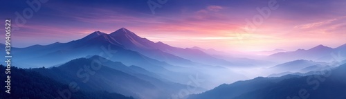 A breathtaking view of layered mountains at dawn, showcasing vibrant colors in the sky, surrounded by misty valleys.