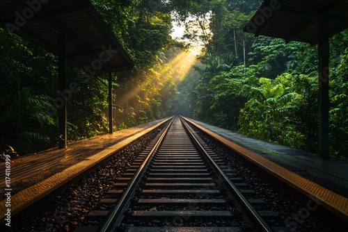 A breathtaking view of railway tracks amidst lush greenery, capturing the enchanting light filtering through the trees.