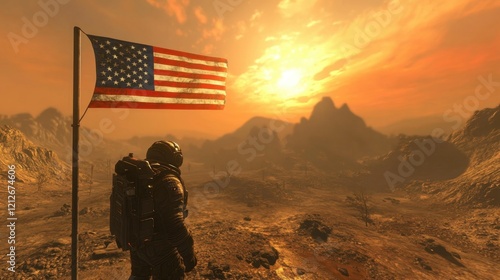 A breathtaking view of the American flag and astronaut on Mars, with distant mountains under an orange sky.