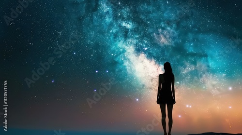 A breathtaking view of the Milky Way illuminated across the night sky, with a silhouette of a girl standing beneath it.