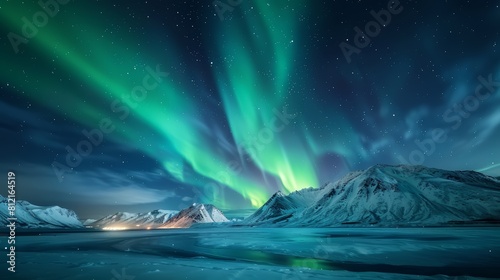 A breathtaking view of the Northern Lights dancing above snowcovered mountains