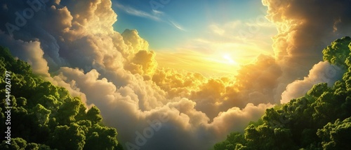 A breathtaking view of the sun rising above clouds, surrounded by vibrant greenery. Perfect for nature lovers and serene landscapes.