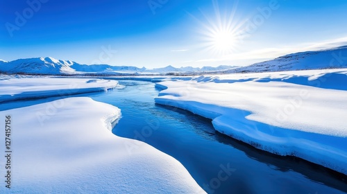 A breathtaking winter landscape features a serene river cutting through thick, gleaming snow under a bright blue sky. The peaceful scene captures the beauty of nature in winter.