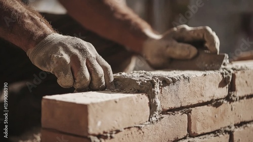A bricklayer laying bricks for an exterior wall. Featuring craftsmanship and precision