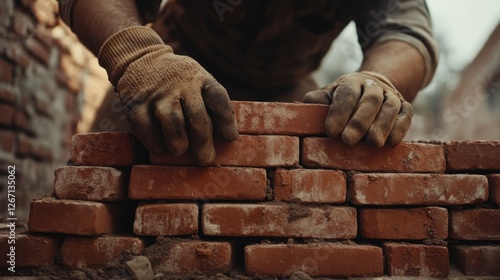 A Bricklayer's Hands Carefully Placing Bricks, Construction Work, Manual Labor, Building a Wall