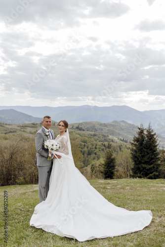 A bride and groom stand on a grassy hillside, posing for a picture. The bride is wearing a white dress and the groom is wearing a suit. The scene is set against a backdrop of mountains