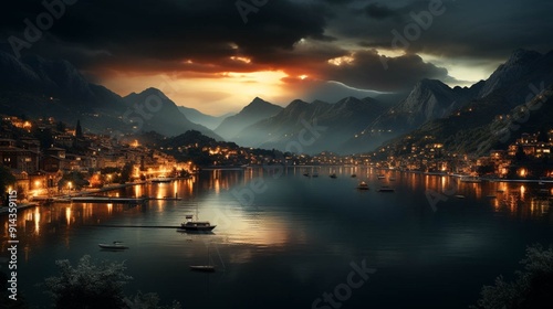 A bridge with road light over a river with mountains at evening moment
