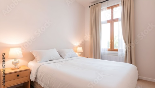 A bright and airy bedroom interior featuring a neatly made bed, bedside lamps, and a window with curtains.