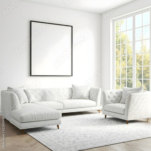 A bright and airy living room bathed in natural light from large,paned windows overlooking a lush garden. The room is anchored by a plush, light colour sectional sofa adorned with soft, neutral pillow