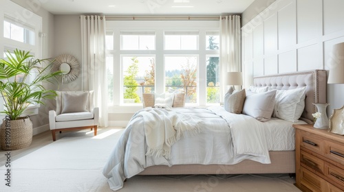 A bright and airy modern bedroom featuring elegant furniture, plush bedding, and large windows allowing natural light to flood the space