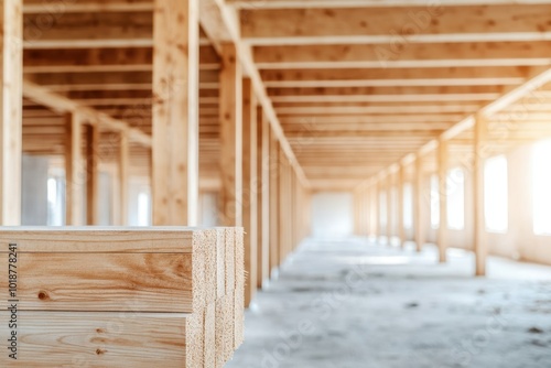 A bright and airy wooden structure under construction, with beams and natural light filtering through, ideal for modern industrial spaces and architectural projects.