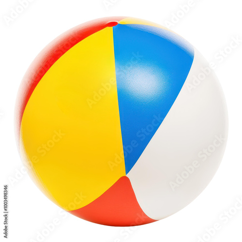 A bright beach ball floats on a white background, perfect for summer fun and beach activities.