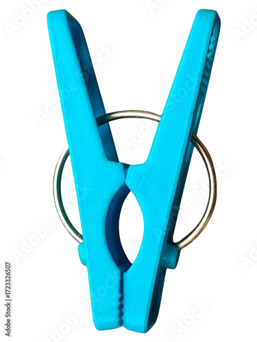 A bright blue clothespin with a circular metal spring, designed for gripping and holding items securely.