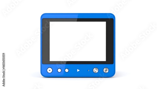 A bright blue rectangular device with a blank screen and control buttons