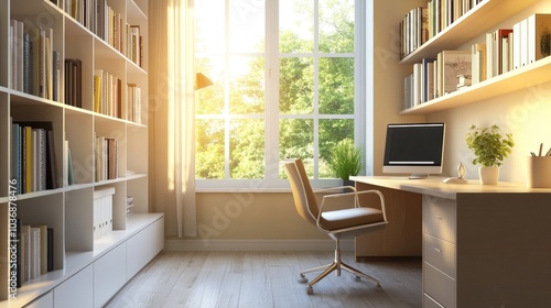 A bright, contemporary home office interior with a sleek desk, modern chair, and large bookshelf, with soft lighting and neutral tones.
