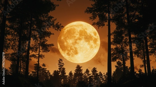 A bright full moon illuminating a serene forest, with silhouettes of tall trees in the foreground.