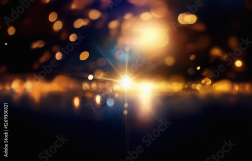 A bright golden light shines in the center of a black background. The light is surrounded by rays of light and a soft glow.