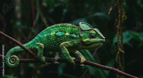 A bright green chameleon perched on a branch against a backdrop of lush green foliage in a natural setting