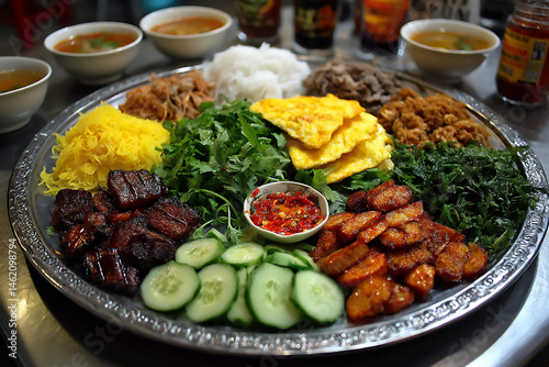 a bright image of a banh mi tasting platter featuring small portions of different fillings like shredded chicken, vietnamese sausage, and fried eggs