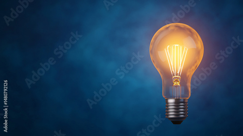 A bright incandescent light bulb glows against a deep blue background creating a warm light effect.