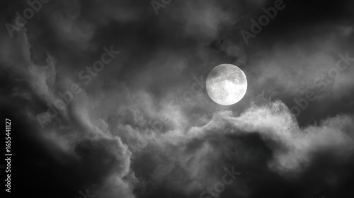 A bright, luminous moon shines through dark, ominous clouds at night