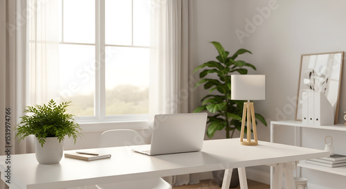 A bright, minimalist home office space with a laptop, plants, and a window view.