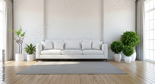 A bright, minimalist living room featuring a plush white sofa, a simple gray rug, and several potted green plants, bathed in natural light from large windows.