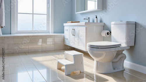 a bright modern bathroom interior with a white toilet, step stool, and folded children’s training seat on top